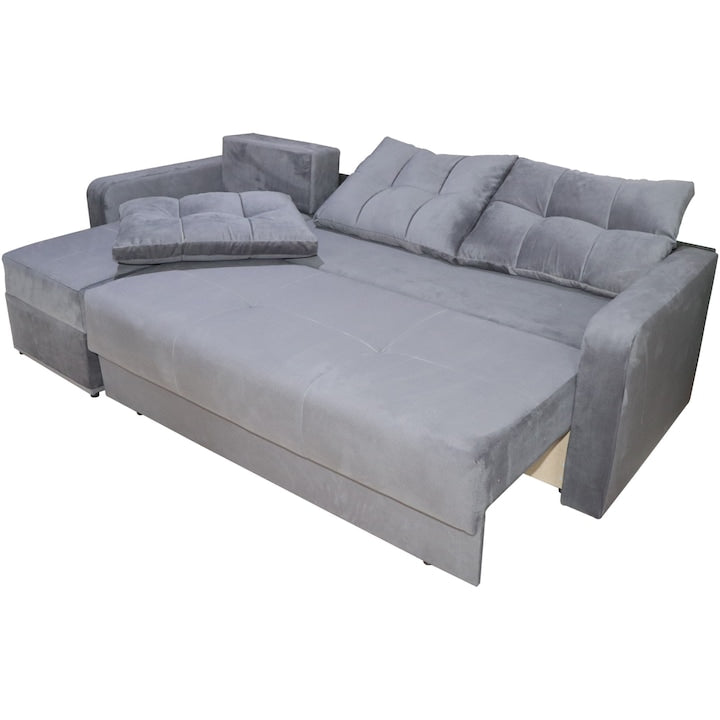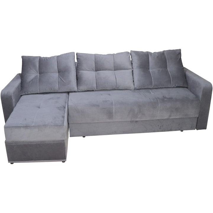 Confort si functionalitate: Sezutul generos si spatarul confortabil sunt realizate din spuma de inalta densitate, oferind sustinere ergonomica. Mecanismul extensibil transforma coltarul intr?un pat de 220x140 cm, ideal pentru oaspeti sau pentru relaxare. Lada de depozitare integrata in sezlong este utila pentru pastrarea lenjeriei, pernelor sau paturilor.