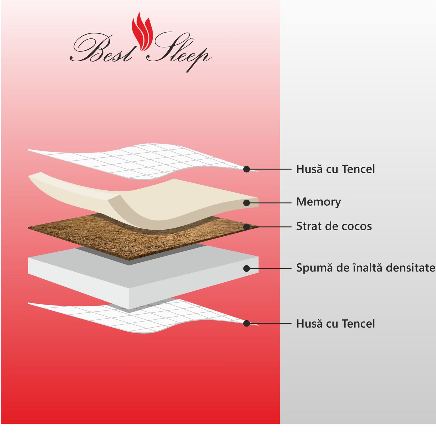 Strat de Cocos: Cocosul este un material natural durabil, cunoscut pentru proprietatile sale de ventilare si rezistenta la deformare. Un strat de cocos in saltea poate oferi un suport solid si uniform, contribuind la prevenirea afundarii excesive si la mentinerea formei saltelei pe termen lung.