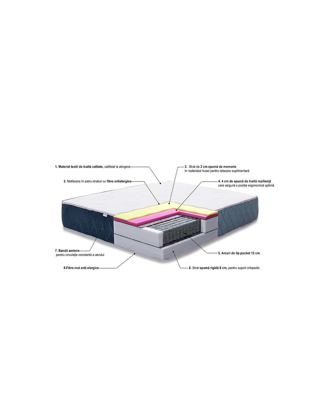 - spuma de inalta densitate isi recapata foarte rapid forma, astfel incat vei dormi confortabil indiferent de cat de mult te misti in timpul noptii.