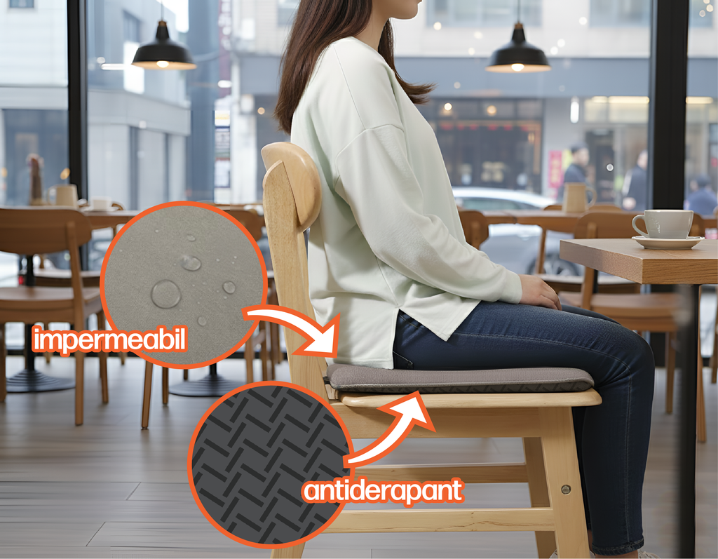 Umplutura din spuma cu memorie se muleaza pe forma corpului, reducand presiunea si imbunatatind confortul, iar stratul antiderapant mentine pernele stabile pe scaun. Materialul exterior este impermeabil, protejand impotriva umezelii si murdariei accidentale.